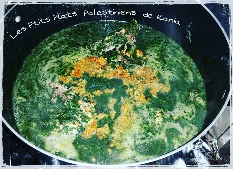 3) Ajoutez le poulet et le bouillon sur le Mloukhyeh, juste assez pour que la mixture devienne liquide (mais pas trop quand même ! ).