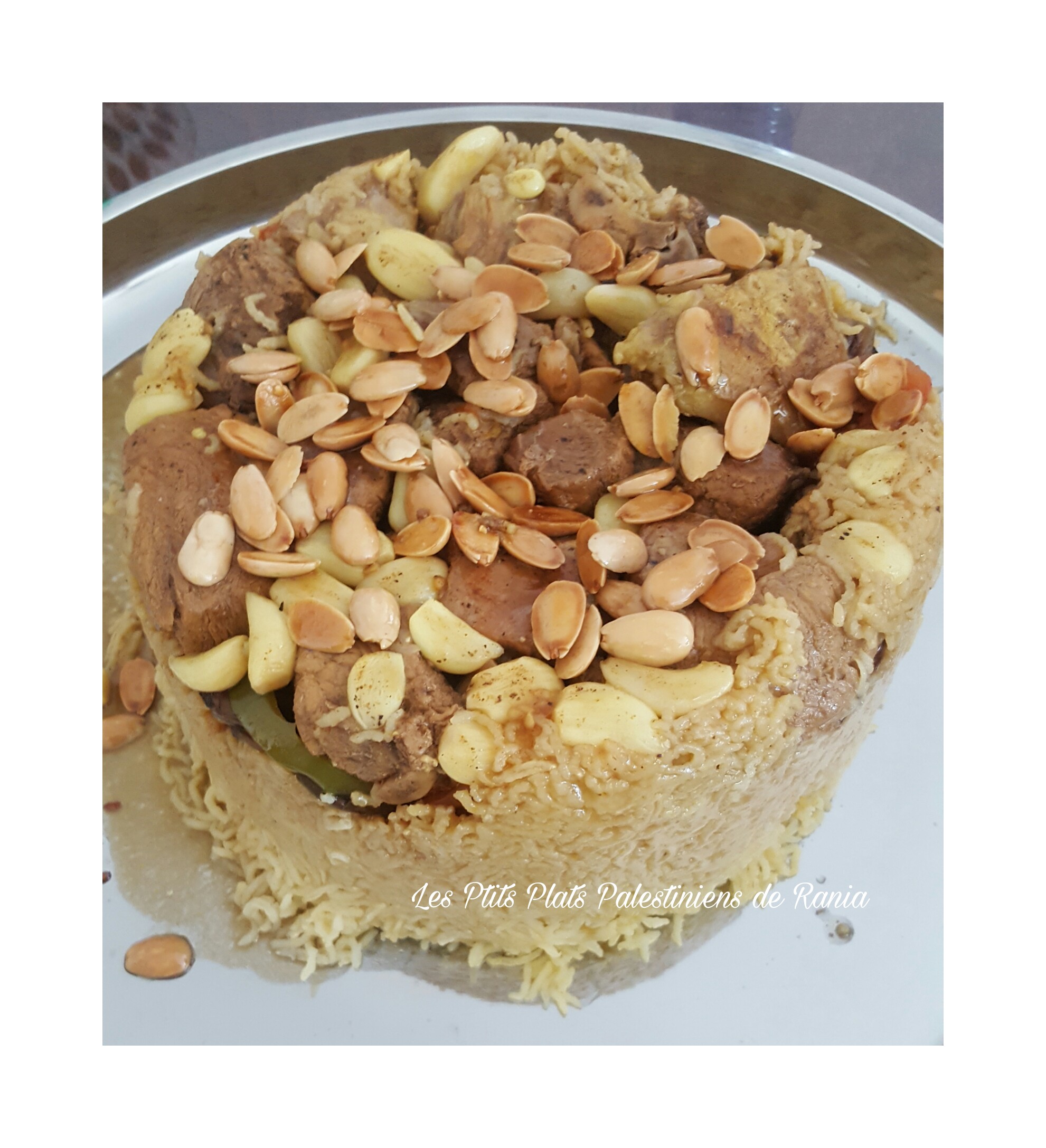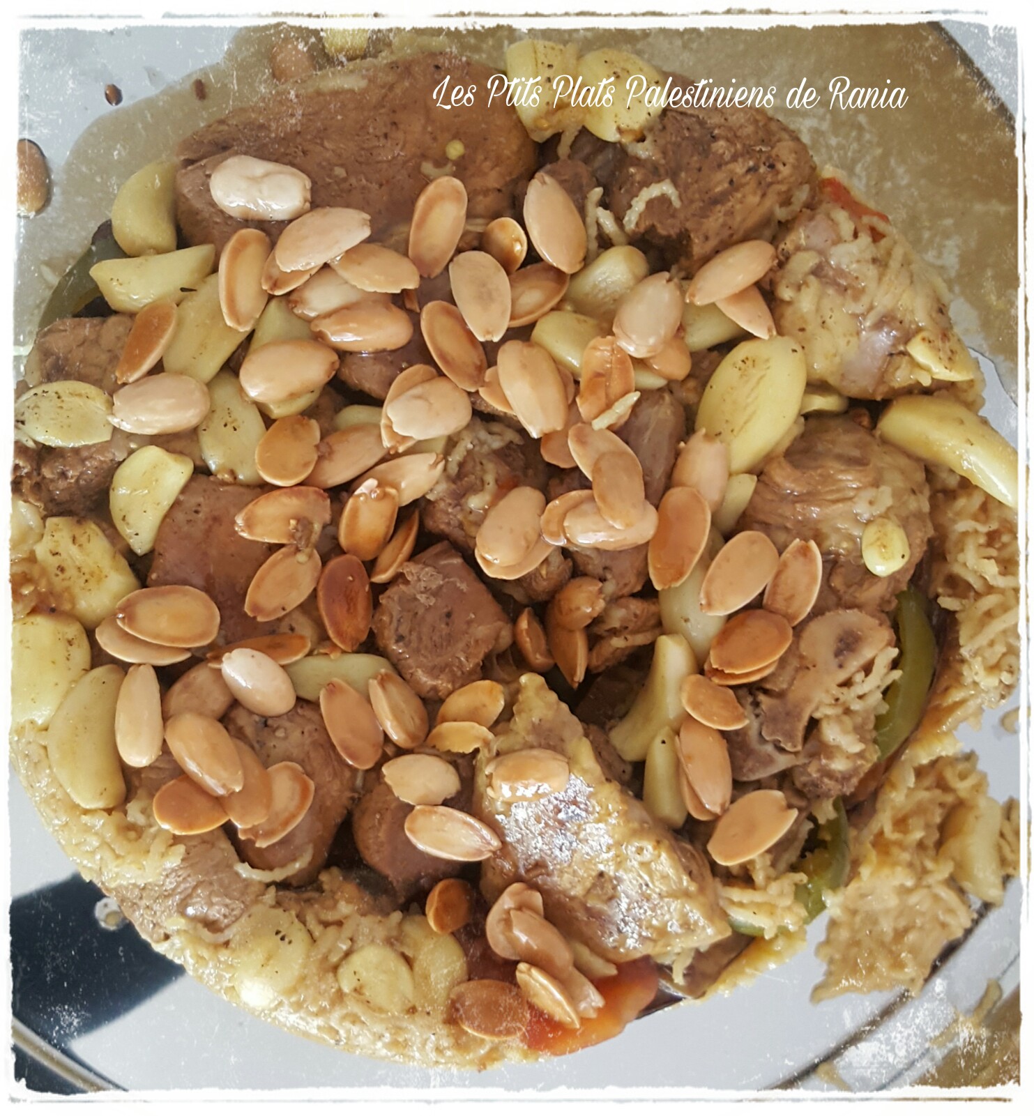 D’autres (comme à Jérusalem) rajoutent de grandes quantités de gousses d’ail et des amandes et/ou des pignons de pin revenus dans du samneh (beurre de ghee/clarifié) et recouvrent le riz avec… Ma maman, cette fois ci (et c’est une première!) a mis des poivrons et des tomates et c’était une superbe surprise gustative! 😋